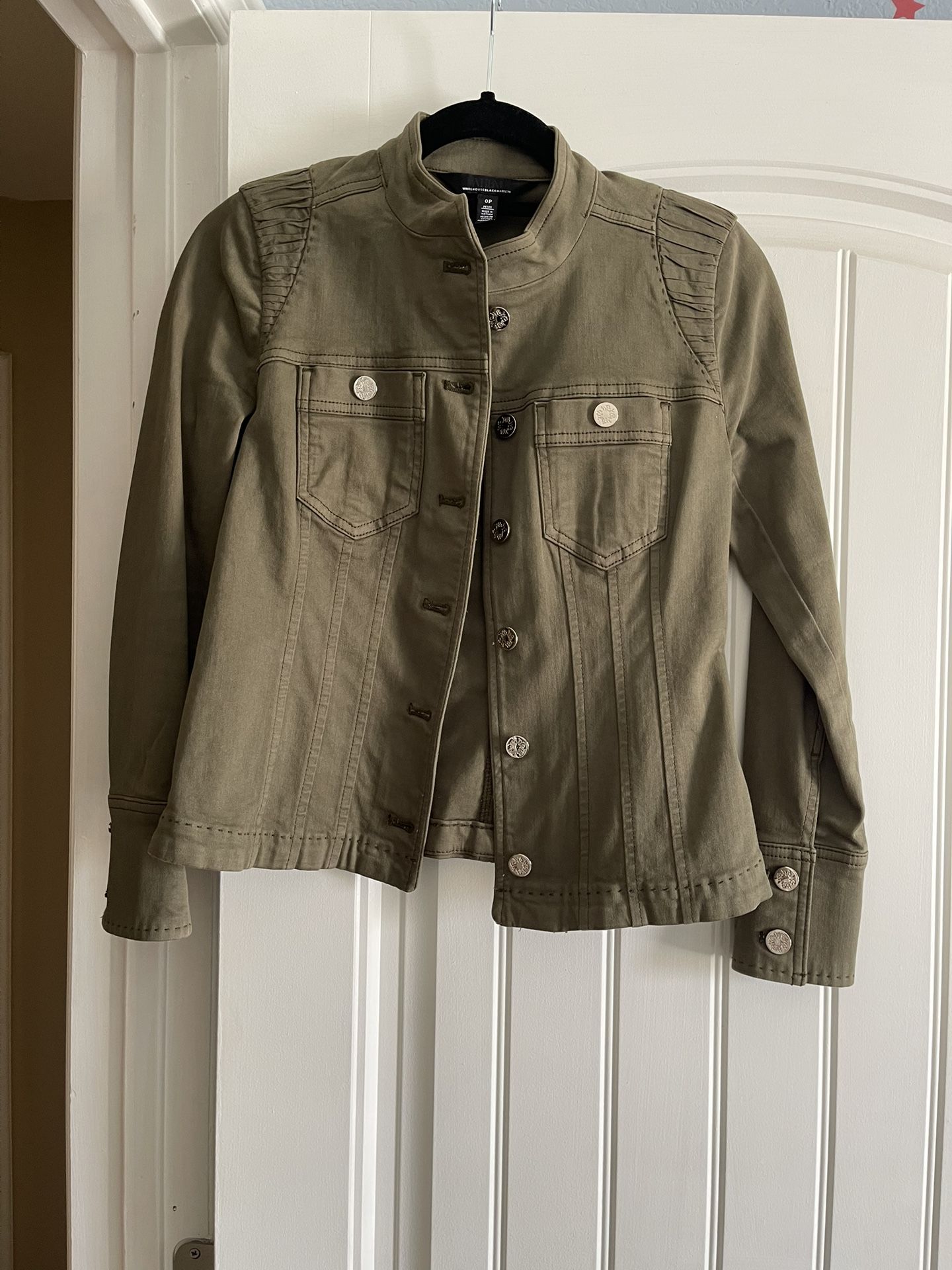 White House Black Market fitted jacket in the color army green. This jacket is flattering and goes well with a casual outfit or dress. It has stretch in the material for extra comfort. Wore it a couple of times but then I got pregnant and don’t fit in it anymore. Cash only. $40