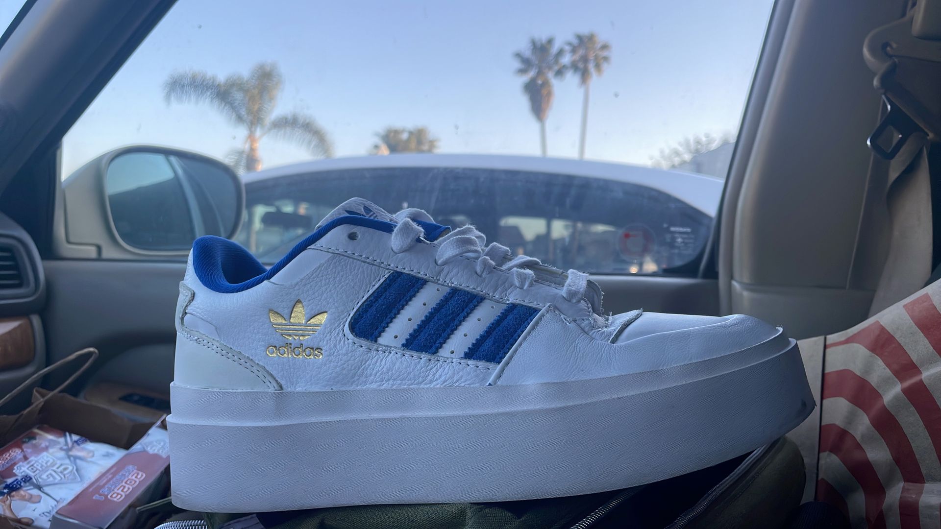 White and blue Adidas size 8 1/2 Very nice they’re worn like once they pretty much brand new new box 25$
