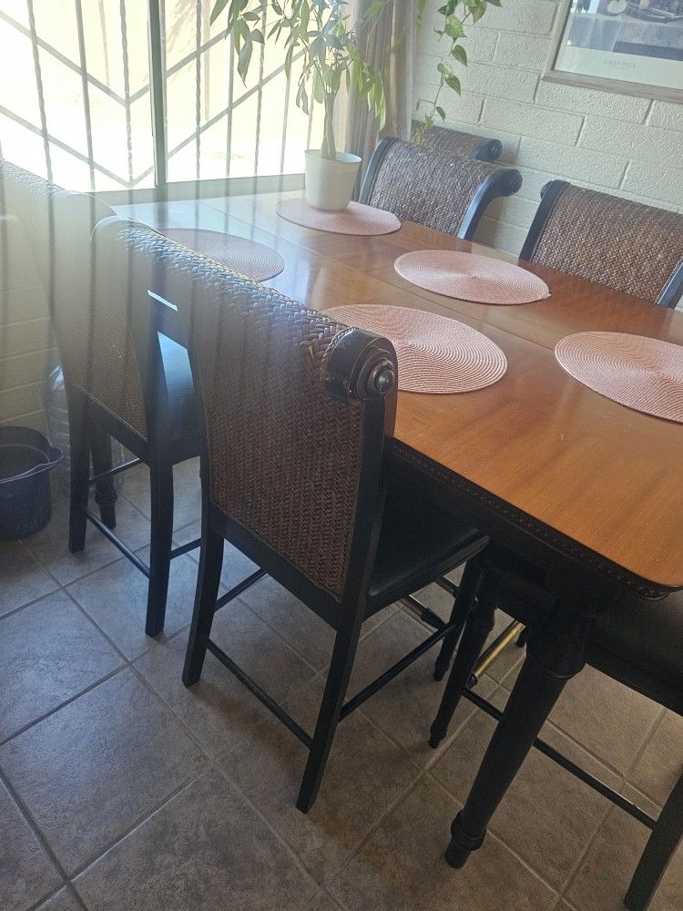 wood table with high top chairs leather cushion has extention on bottom to make table bigger