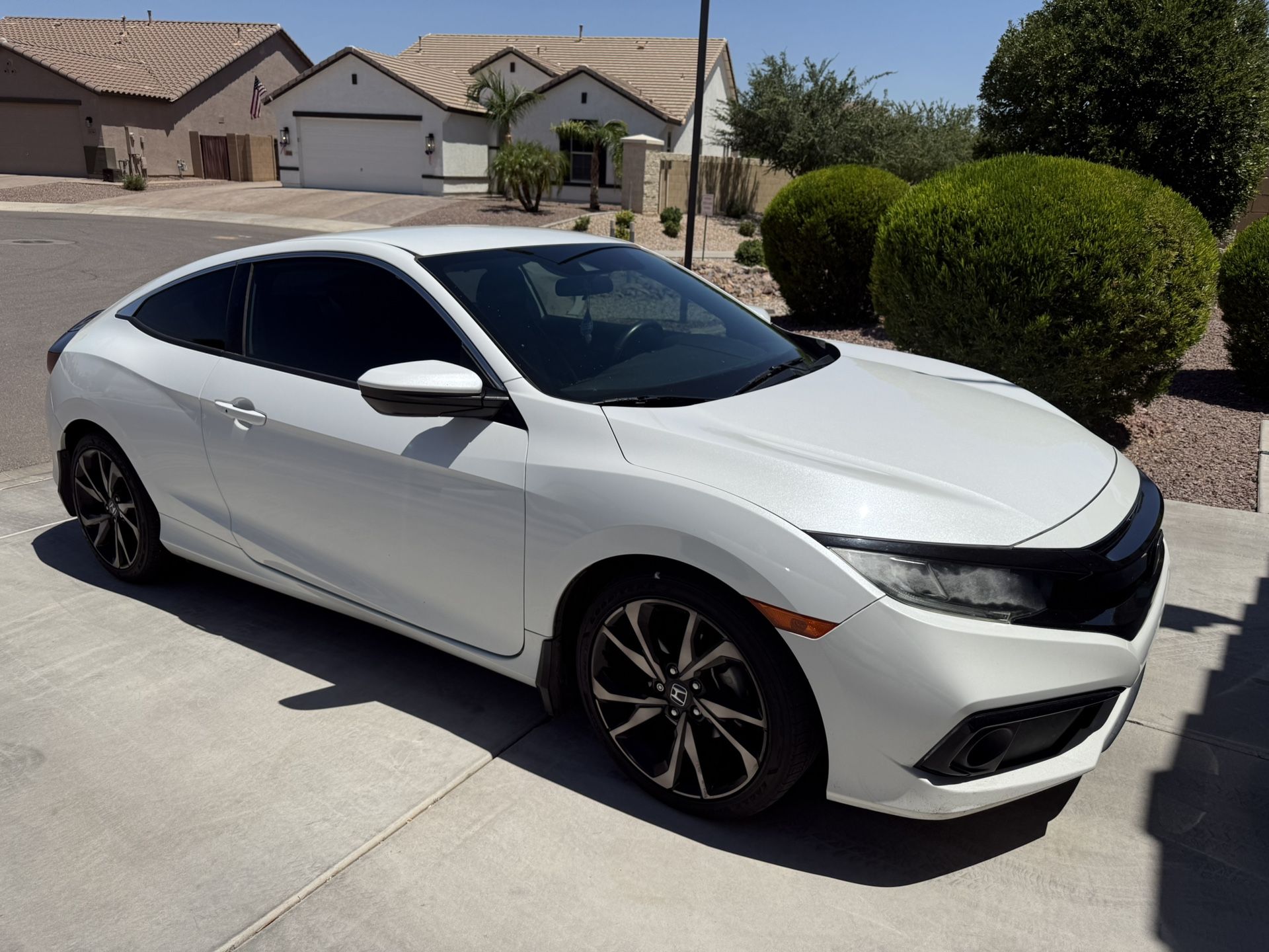 2019 Honda civic coupe sport FWD automatic 50k miles Pearl white exterior black interior with grey sport stripe on seats Specs Remote start Bluetooth, Apple CarPlay, android auto Hands free calling Active lane keep assist Adaptive cruise control Rear view camera Collision detection Automatic emergency breaking Has dent on drivers side doesn’t affect the way it drives and is easily fixable.