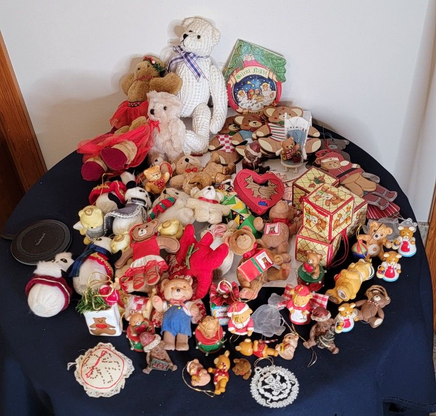 Calling all bear lovers! I am selling a massive, curated collection of teddy bear Christmas ornaments and figurines. This set includes a wonderful variety of styles, textures, and characters perfect for a themed tree or a nursery. Collection Includes: Plush & Knit Bears: Including a large white cable-knit bear and several small jointed fuzzy bears. Resin & Figural Ornaments: Various "Cherished Teddies" style bears on drums, in Santa suits, and playing. Wooden & Flat Accents: A stack of vintage wooden bear cutouts and a "Silent Night" decorative plaque. Unique Finds: Panda bears, ballerina bears, and even small bear-themed gift boxes. Everything is in great vintage condition. Storage bin included! Pickup in Summerfield Cash or venmo accepted