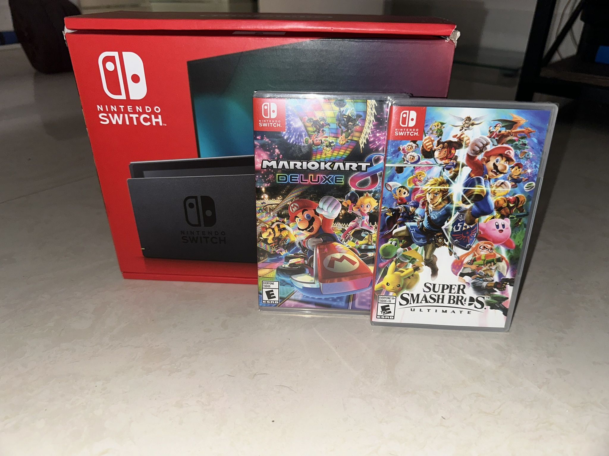 Unopened brand new switch for sale. Comes with Super Smash Bros (MarioKart Deluxe was sold) unopened and new.