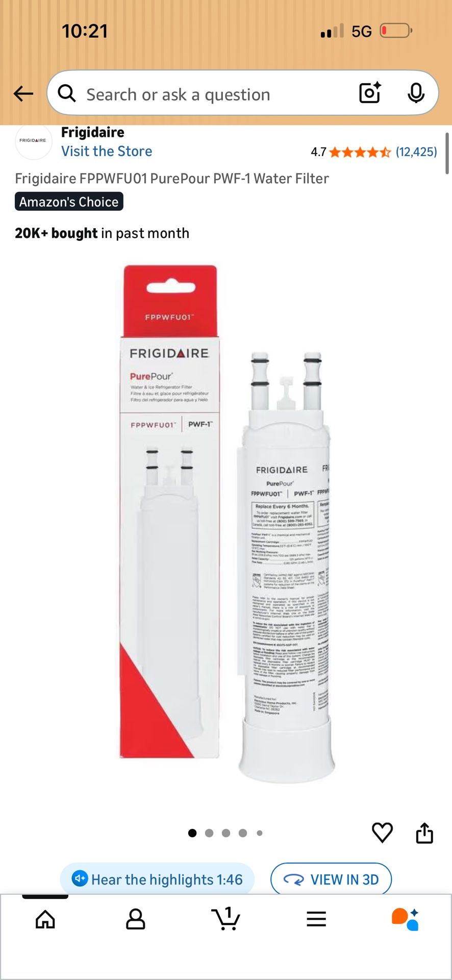 Frigidaire FPPWFU01 PurePour PWF-1 Water Filter