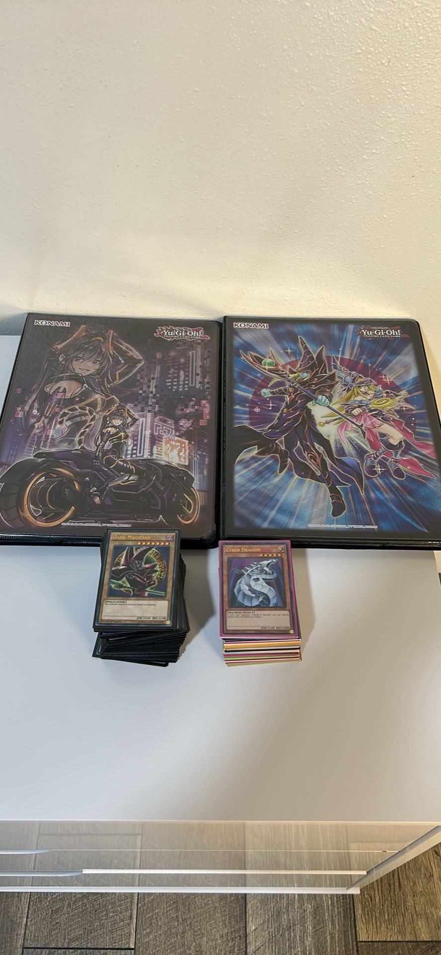 This is my personal yugioh card collection All the cards are in good condition all sleeved up. Comes with 2 binders for you to storage them. I have them organized 1996 cards are in the design sleeve while the 2020 cards are in the colorful sleeves. Did the price check on each card on collectr and the total for 1996 cards is 271.72$ 2020 cards is worth 148.31$ For a grand total of $420.03 and I’m selling it for 250$ 156 cards and 2 binders!