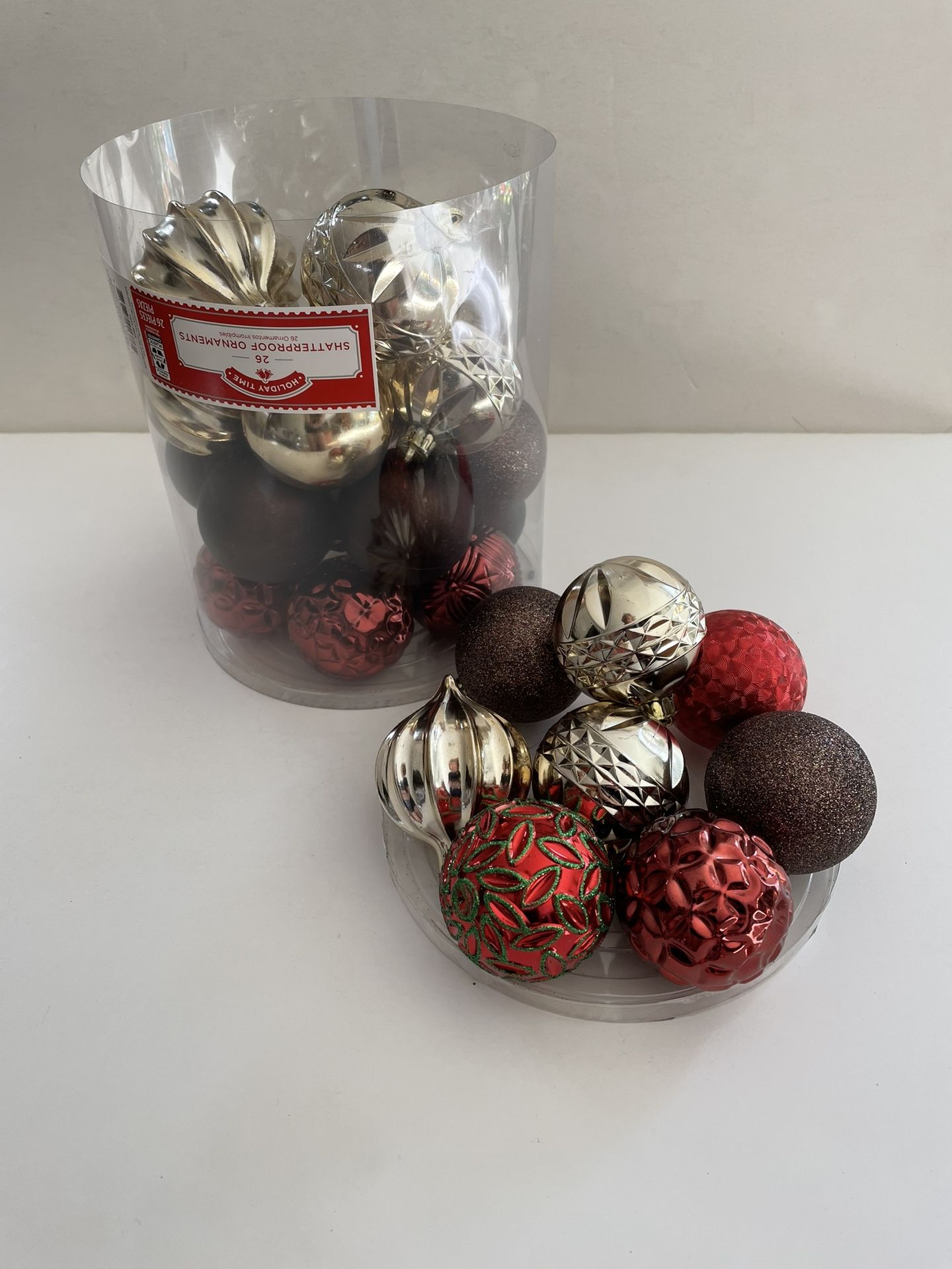 26 - Christmas Ornaments, Shatterproof, Red, Green, Gold, Bronze, In Container