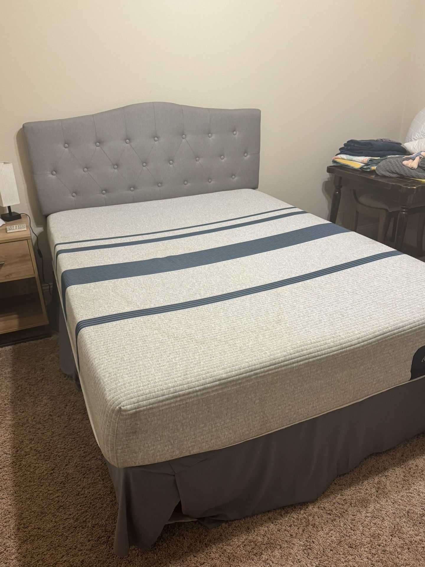 Queen mattress, box springs, and headboard. Very clean and in good condition. The mattress cover lost its zipper but still works, just harder to carry. It’s been an extra bed so not overly slept in!! Will take any price.