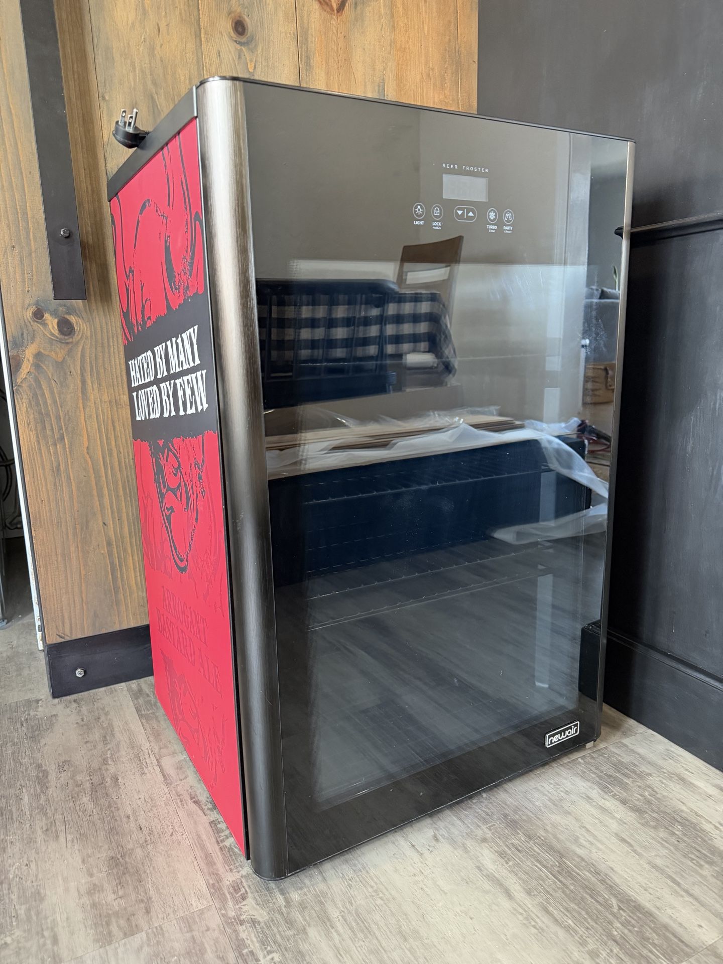 NewAir 125 can beer fridge. Works great! We’ve had it for a few years now, and unfortunately it won’t fit into the built in cabinet anymore since we changed our flooring. We have to look for something else now but a great appliance if you have the space! Height: 33” Width: 22 1/4” Depth: 20” The NewAir SBF125AB00 is a 125-can capacity, 22-inch freestanding beverage cooler designed in collaboration with Stone Brewing as part of their "Arrogant Bastard" beer series. It is often referred to as the NewAir 125-Can Beer Froster with specialized "fast-frosting" modes. Key Features and Specifications Rapid Cooling (Turbo Mode): Features a "Turbo" mode designed to chill beverages to an ultra-cold 23°F in under 1 hour. Party Mode: Runs the compressor at full power for 6 hours to maintain low temperatures despite frequent door openings. Capacity: 3.5 cu. ft. capacity, holding up to 125 standard 12-oz. cans. Design: Features a heated glass door that resists frost buildup and black/red graphics. Temperature Range: Adjustable settings range from 23°F to 72°F. Interior: Includes adjustable and removable shelves and internal LED lighting. Located in Carlsbad right off of the 5fwy at Tamarack.
