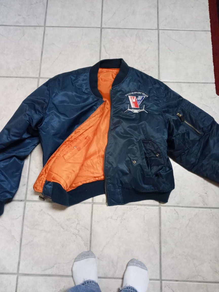 100% nylon shell n lining. All heavy duty MA-1 MIL-J-6141 materials, Zipper, snaps. Hardly worn. In Mukilteo can deliver if nearby. See profile for more items on sale make offers.