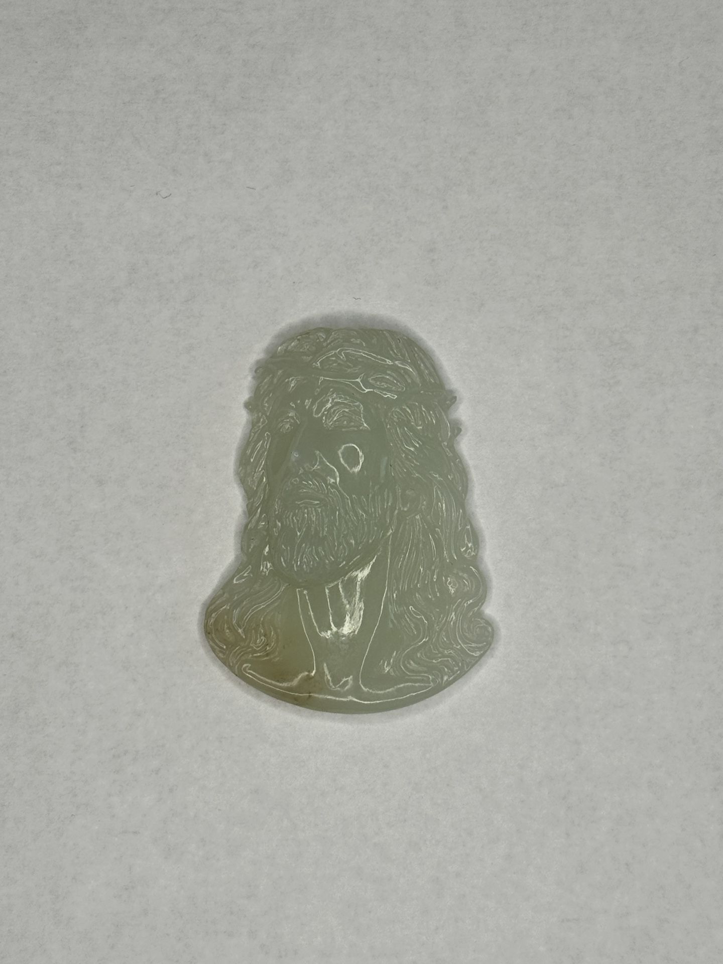 This is a handmade pendant featuring a finely detailed carving of Jesus Christ with a crown of thorns, crafted from Siberian A Type Jade. The piece was carved by skilled artisans in Vietnam and includes a pre-drilled hole, ready to be set with a bale for wearing as a pendant. • Material: 100% Natural Siberian A Type Jade • Origin of Jade: Siberia • Carving Location: Vietnam (hand-carved) • Subject: Jesus Christ bust with crown of thorns • Type: Pendant (hole included for bale) • Dimensions: 2 inches x 1.5 inches • Weight: 22 grams • Condition: New, handmade (minor natural inclusions in jade confirm authenticity) Features: • Fine detail in Christ’s face, beard, and hair • Semi-translucent jade that glows under light • Pre-drilled hole for easy jewelry setting • Wearable as a pendant or collectible religious art • Unique handmade piece — no two are exactly alike Perfect For: • Religious jewelry collectors • Devotional Christian gifts • Jade enthusiasts • Custom jewelry making