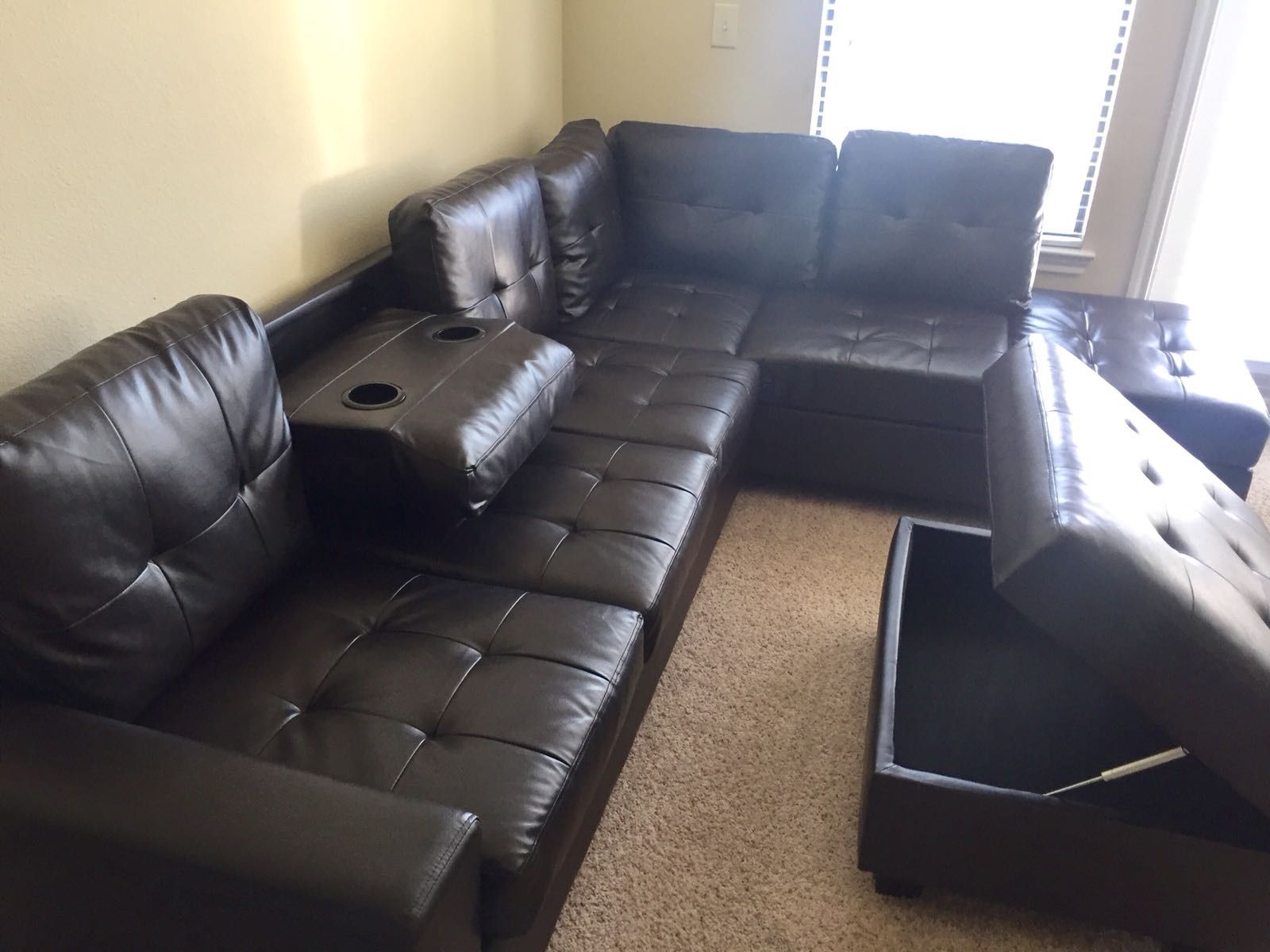 “New in Box” Color - Black or Espresso Material: Leather Description: Reversible Sectional and Storage Ottoman Set (Sold as Set Only) Sleek, simple, and modern. This sectional covered in thick durable faux leather features a drop down cup holders table and a storage ottoman. Don't forget, it's reversible! Dimension: RAF SOFA: 78L x 34D x 34H LAF CHAISE: 80L x 34D x 34H Storage Ottoman: 34 x 24 x 18H ✅Same Day Delivery 🚚 Drop off ✅Financing Available Boxed item requires Assembly.