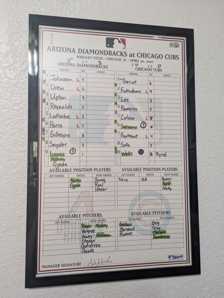 A lineup card from 2010 when the Diamondbacks played the cubs at Wrigley field. Is signed by AJ Hinch, the manager of the Dbacks at the time. Has the hologram certification sticker and is framed. Frame measures 18" tall and 12" wide. Pick up only.