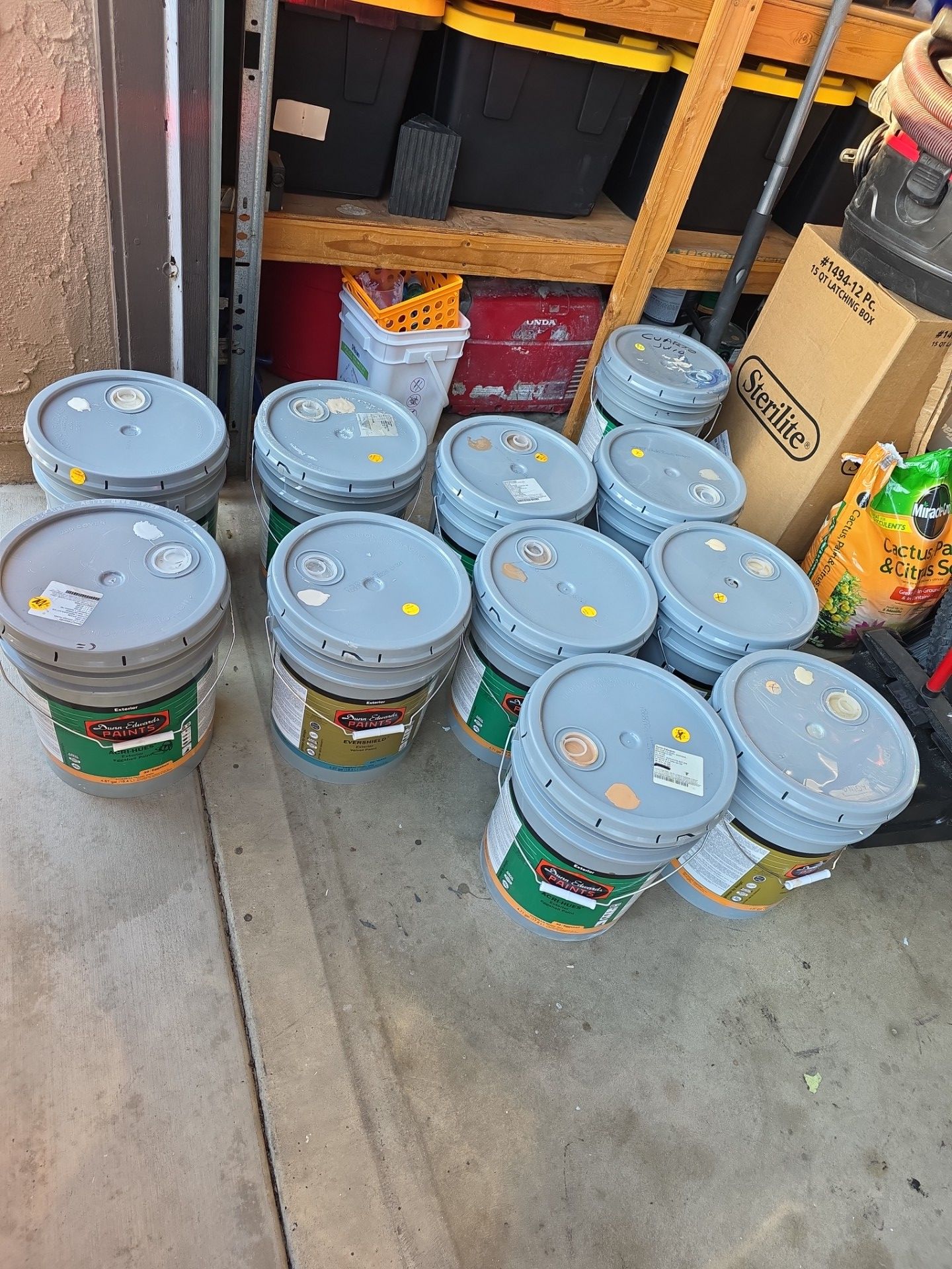 I have 19...... 5 gallon buckets of Dunn-Edwards paint (exterior only) $$75 dollars a bucket different colors Tan, Brown ,white, light brown , dark brown... Need to get rid of ASAP taking offers