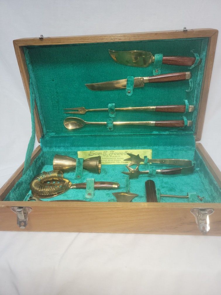 Vintage mid 20 centuary 9pc bar set Brass and wood 2 sizes of knives Long handle forks Long handle spoon Ice tongs Ice strainer Bottle opener Jigger Corkscrew Velvet lined box 8 x 13 x 3in Made in Thailand Purchased in Bangkok Vietnam era NEW Stored for over 50 years Please see my other listings including more wood and brass items