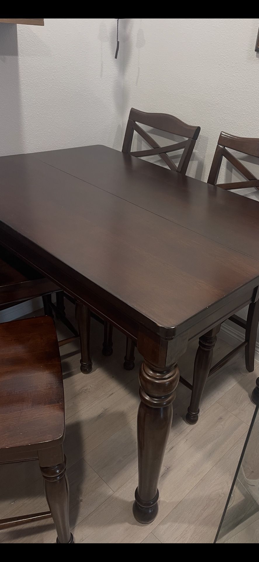 Four chair dining table, very heavy wood. Table has glass on top & is included. Has a few nicks from regular wear but still looks great and very SOLID sturdy. I will continue to use until sold. Must pick up and load on your own. No shipping $400 Thx!
