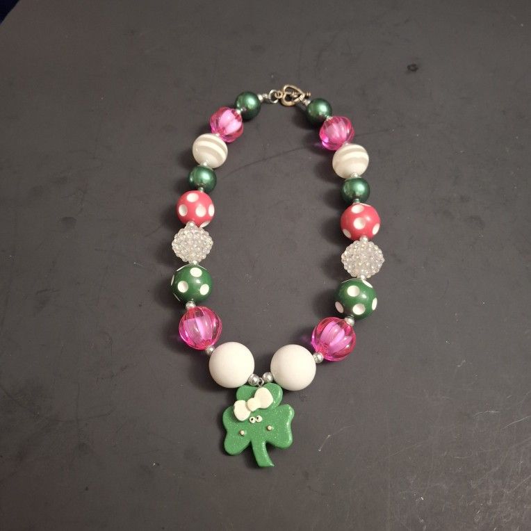 St. Patrick's Day Clover ☘️ Chunky Bubblegum 16" Beaded Necklace W/Silvertone Spacers-Green, Pink, Iridescent & White Beads W/Toggle Clasp