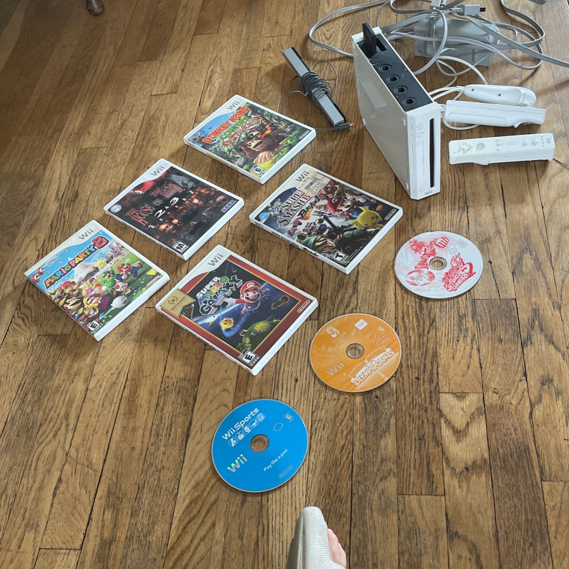 Wii console with 1.5 controllers 1 full controller with nunchuck 1 with no joystick control nor back battery covering. Games Mario party 8 House of the dead 2 & 3 Donkey Kong Country returns Super Mario Galaxy Super Smash Bros Brawl Mario & Sonic olympic games Mario strikers charged Wii games