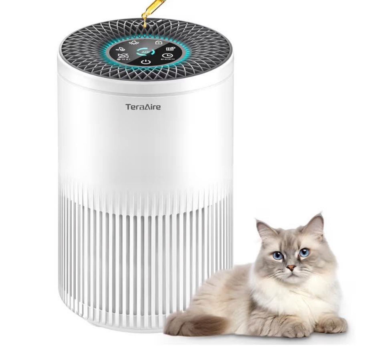 Brand new Brand new Air Purifiers for Bedroom Home, Air Purifier with PM 2.5 Air Quality Monitor Cover Up to 1235 Ft², Air Filter Cleaner with 5 mode Light, Sleep Mode, Timer, Fragrance Sponge for Smoke, Odor, Dander Color white Brand TeraAire Product Dimensions 6.8"D x 6.8"W x 10.9"H Power Source dc Item Weight 2.4 Pounds Control Method Push Button Widely Use: Our Filter capture lint, hair, pet dander, fine airborne pollutants, and smoke particles, suitable for living rooms, bedroom, dorm, kitchen, office,classrooms. helping achieve a cleaner environment for you Easy to Use & Filter Replacement :The air purifiers are easy to install with a concise instruction manual. And when the air purifier Filter needs to be replaced, this indicator light will turn red,after replace the filter, long press the button 3s to reset the light (based on TeraAire Original Filters; not applicable to other replacement filters). Aromatherapy Air Purifier: TeraAire purifier features aromatherapy functionality, you can use essential oils on the aromatherapy pad at the top of the purifier. Add 3-5 drops to gradually release the aroma by the pad. Different oils may produce varying effects based on their scents. Quiet Air Purifier: We have designed sleep mode and the noise the air purifiers is as low as 20dB, is as silent as your own breath, ensuring a peaceful and undisturbed environment while still providing effective purification. And you don't need to worry about the quality of the product, all of our materials are carefully selected, and the air purifier has also undergone multiple quality tests.purify the air of 1235ft² spaces once per hour. Independent Night Light and 4 Timers: It is designed to serve both as an air purifier and a night light. Dual function design makes it a good choice for babies and young children, who can find the softly glowing light or a soothing night time companion. Besides, the air purifiers come with 1-2-4-8 four-timers that fit your needs while you're away from home.