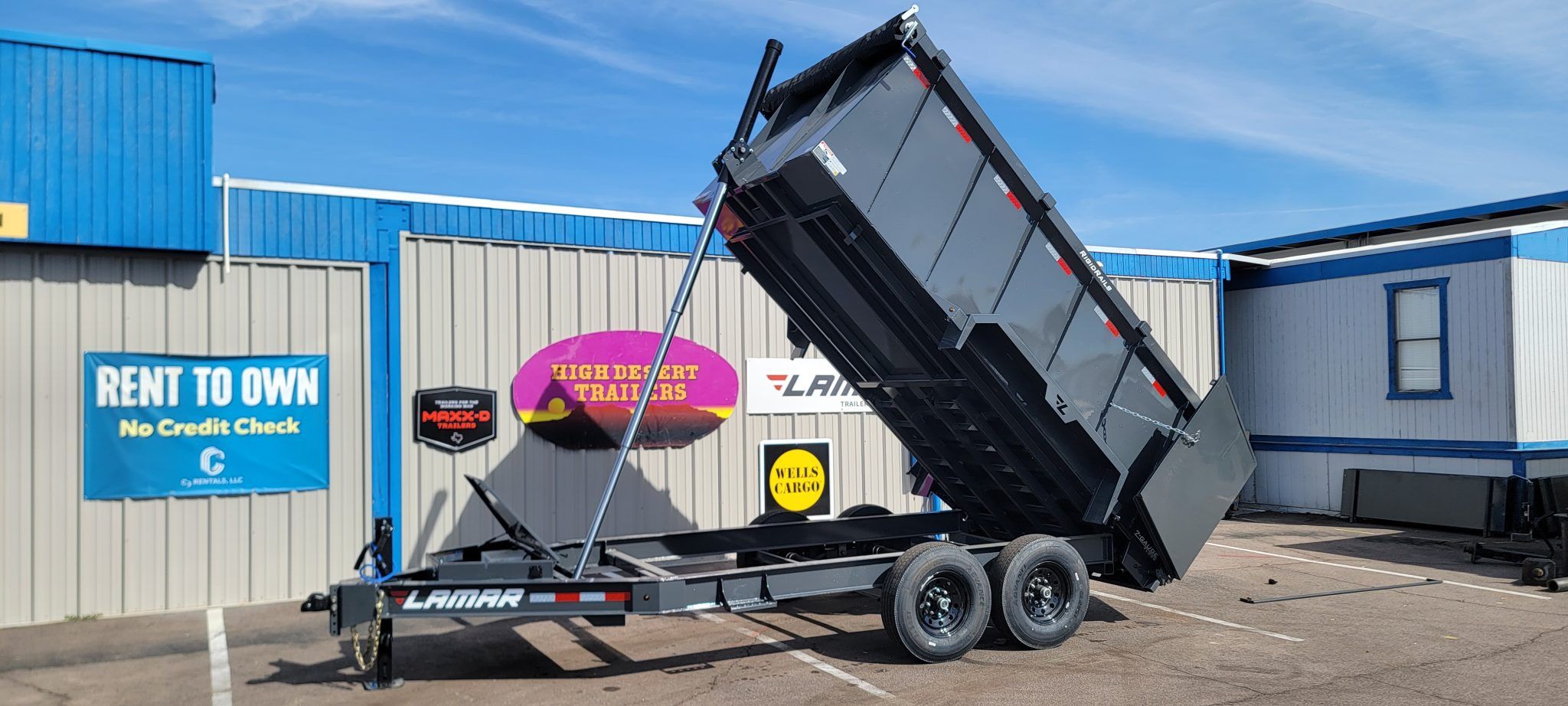 Lamar’s 14,000 lb. dump trailers are Arizona’s most popular dump trailer. They feature Heavy Duty I-Beam frames with re-enforced gussets, Thickest on the market “7 Gauge Floor”- thicker than competitions 10 gauge. Tarps, Ramps, 2-way gate, LED lights, Sealed wiring harness, sand blasted prep- powder coated finish, Gas shock on tool box lid, Ultra Heavy-Duty Rigid Rails, and a 3-year frame warranty, 6-year axle warranty, and Life Time LED light warranty. Sales Price $13,580 + tax - Cash discount – CASH OR CASHIERS CHECK ONLY WE WILL BEAT ANY COMPETITORS PRICE BY HUNDREDS OF DOLLARS FREE DELIVERY TO FLAGSTAFF Card will incur a 3% increase Tax is not included Applicable taxes will be added at time of purchase 8″ 13 lb I-Beam Frame 48″ Sides 12″ Spaced Crossmembers 7 Gauge Floor One Piece No Seams Front Tool Box Spreader Gate Easy Roll Mesh Tarp Standard Stake Pockets Pair Of Heavy Duty Slide In Ramps Led Lights 5 Amp Trickle Charger 12V Deep Cycle Battery Kit 3 Way 12V DC Pump 12k Jack Electric Brake(s) 8 Hole Wheels Cambered Spring Suspension Brakes on Both Axles Powder Coated Paint Smooth Fenders D-Rings Installed Front Tongue Toolbox Spare Tire Mount 7-Way Plug Insulated Wire Harness DOT Approved LED Lighting