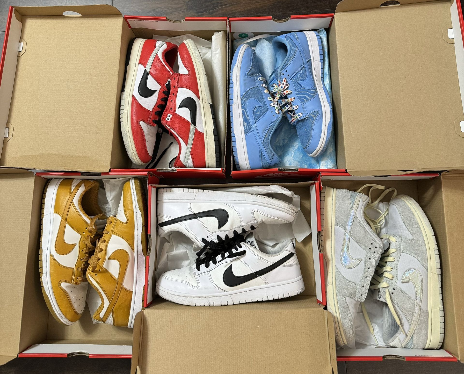 Nike Dunk Low Reverse Panda size 10 $120 Nike Dunk Low Gone Fishing Chinook Salmon size 10 $120 Nike Dunk Low Next Nature Phantom Gold size 11.5W 10M $100 Nike Dunk Low Topography University Blue size 9.5 $120 Nike Dunk Low Chicago Split size 10 $140 ALL USED taking trades as well