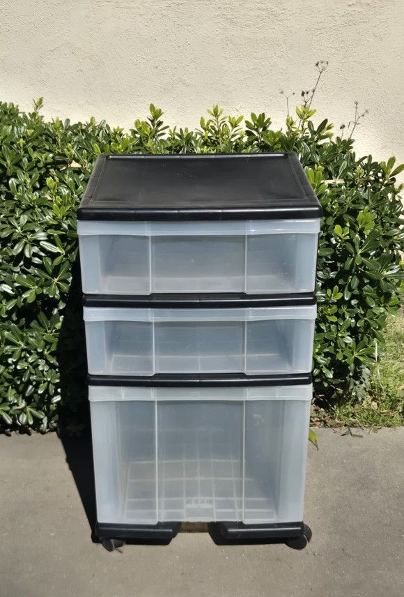 3 drawer black plastic cart on wheels. 16x16x27 inches. In good condition. $10 firm.