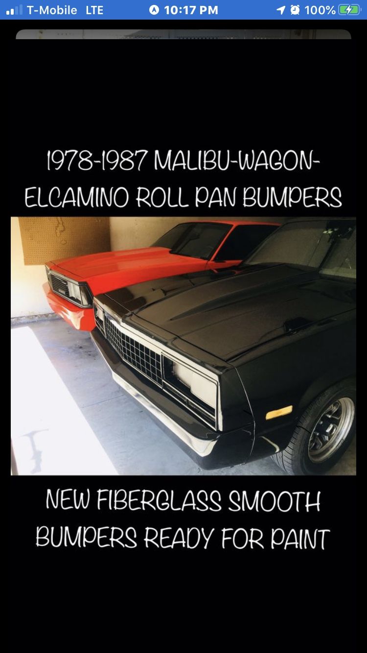 Chevrolet Malibu - Malibu Wagon - El Camino & Caballero Fiberglass Smooth Bumpers Front & Rear Applications Available Now Direct Bolt On To The Factory Bumper Locations $220 For Each Fiberglass Roll Pan Bumper $440 For Both Front & Rear Bumper $660 For Both Front & Rear Bumpers Plus Front Lower Super Sport Spoiler Contact For More Information & Questions "ONLY NORTHERN CALIFORNIA SUPPLIER"