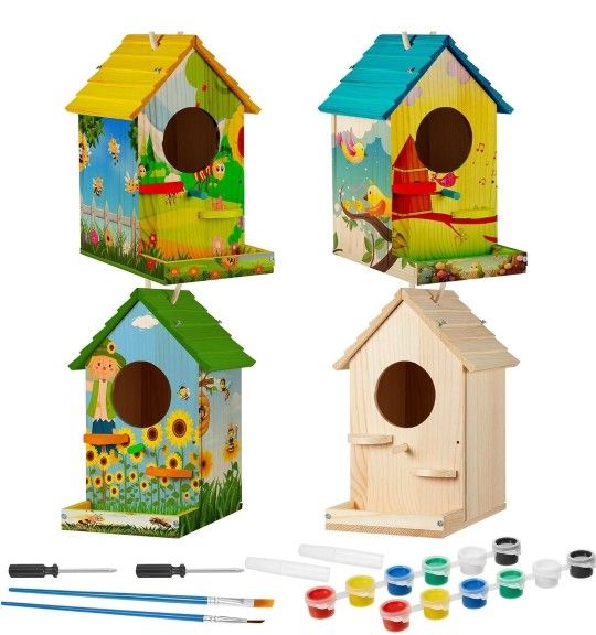 New 4 Pack Birdhouse Kit DIY Wooden Bird House with Paint and Paintbrushes Arts and Crafts Painting Kits for Boys Girls Adults Build Paint