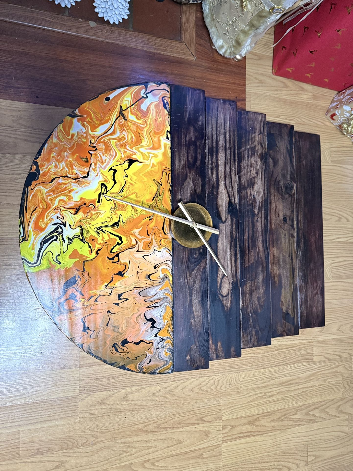 Large handcrafted statement wall clock featuring a bold abstract resin pour paired with richly stained solid wood. The flowing amber, gold, and warm orange tones create a natural stone/fire effect, while the stepped wood design adds depth and architectural interest. Finished with gold clock hands for a clean, elegant contrast. This piece functions as both a timepiece and wall art, designed to anchor a space and start conversation. ✔ One-of-a-kind handmade design ✔ Silent quartz clock movement ✔ Solid wood construction ✔ Sealed for durability Dimensions: 30” H × 34” W × ¾” thick Style: Modern rustic / abstract / statement décor Perfect for living rooms, offices, entryways, or large feature walls. Custom color variations available upon request. Pick up in Vancouver $375 cash only Make offer