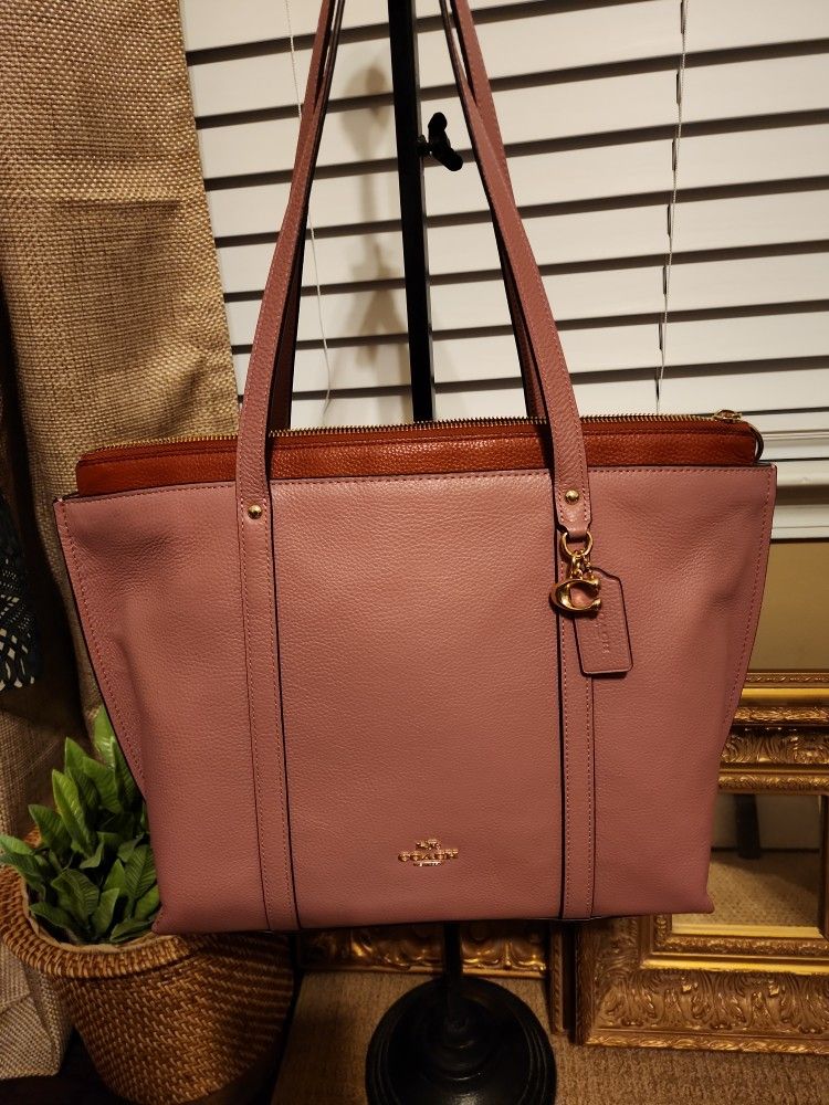 Large leather pink and burnt orange tote with a zipper closure and gold hardware. The bag is new, never worn. It is 13.5" in length and 12" in height. Awesome bag!!