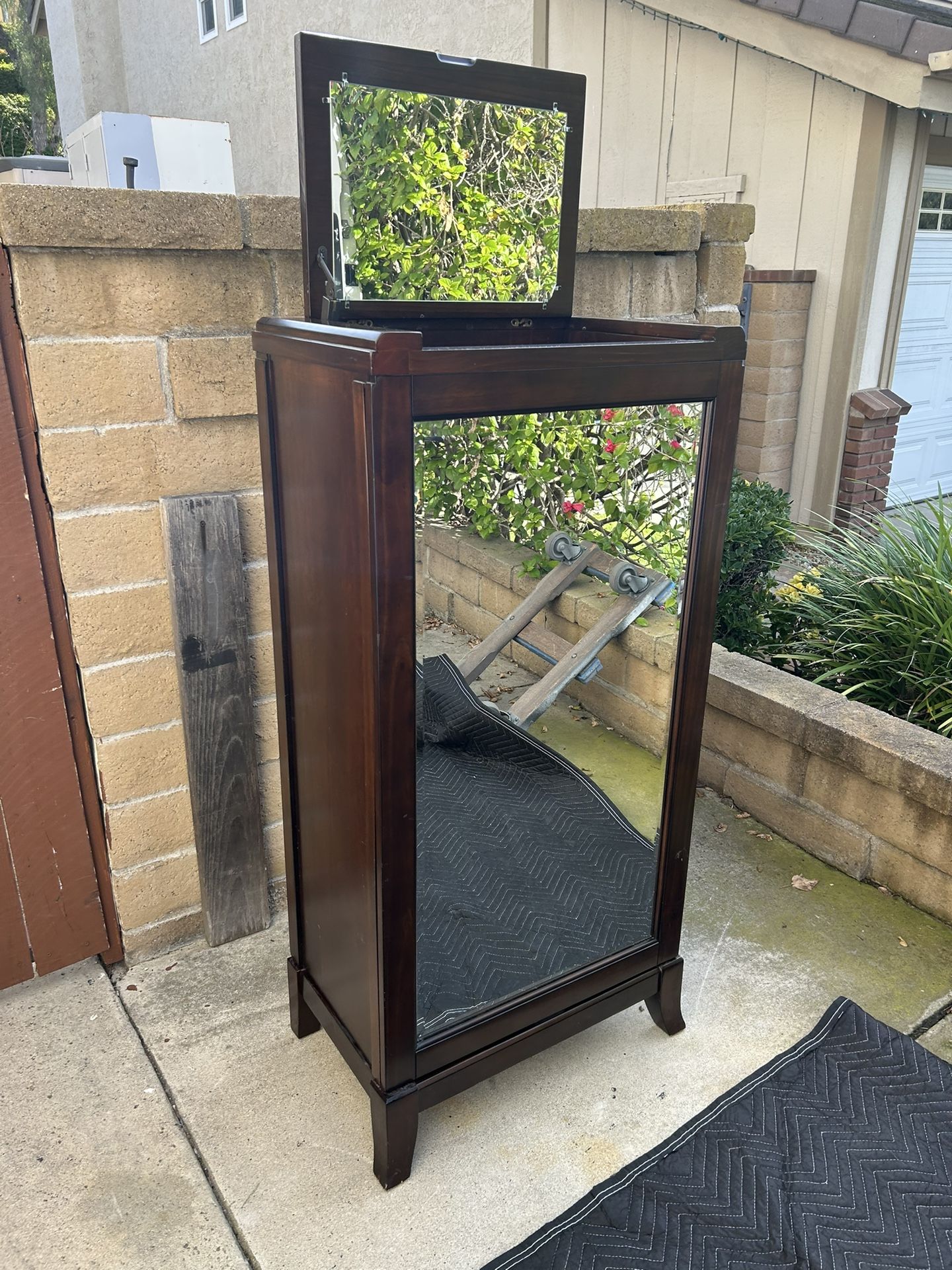 This is a quality combo jewelry lingerie carousel cabinet .On one side is a quality beveled mirror with flip top felt lined jewelry space and then spin the cabinet smooth operating from a metal lover ball bearing carousel plate and you have nice lingerie drawers with handles .What a unique gem.Its 52.5 tall by 25.5 wide and 16 deep in excellent condition.If the ad is up it goes to the first 375 firm save a bundle in this beautiful cabinet and can deliver local if needed we are in Mission Viejo