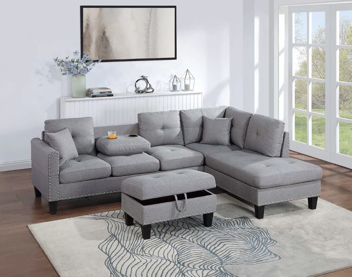 3-Pcs Sectional Set 3pc Sectional Sofa W/ Storage Ottoman Delivery available!🚛 Message us for more info! This sectional is everything you'd ever want in your living space; it comes in a neutral tone that matches almost any style or color scheme. Designed with both comfort and function in mind, this sectional is the ideal choice for anyone seeking a timeless piece that blends effortlessly with nearly any interior. Wrapped in a soft linen-like fabric, it brings a light, airy presence to your space while providing plenty of seating for everyday lounging or entertaining guests. The set includes a Right-Arm-Facing chaise and a Left-Arm-Facing three-seater sofa, offering a balanced L-shape that’s perfect for stretching out or gathering with family. Subtle tufting on the back cushions adds a touch of depth and character, while the medium-firm seat cushions deliver reliable support without sacrificing comfort. The arms are finished with a classic nail head trim, adding a refined, traditional touch that elevates the overall look. An unexpected and convenient feature is the hidden cup holder located in the center back cushion of the sofa—simply pull it down to reveal dual holders that keep your drinks close at hand while keeping the look clean and uncluttered when not in use. Two built-in cup holders are also placed in the armrests for added convenience. A true highlight of this set is the matching storage ottoman, which offers the perfect solution for keeping blankets, magazines, or everyday items tucked neatly out of sight. Whether you're propping up your feet or using it as extra seating, the ottoman completes the set with style and practicality. Two coordinating throw pillows are included to bring extra comfort and a cohesive finishing touch. With its generous size this sectional fits beautifully in medium to large spaces. This 3-piece sectional set is a smart and stylish choice for anyone looking to combine traditional charm with modern-day features that make relaxing at home even more enjoyable. Decorative nail head trim along the arms adds a timeless detail that enhances the traditional charm of this inviting sectional. The combination of a right-arm-facing chaise and a left-arm-facing sofa gives the sectional its signature L-shape, ideal for anchoring your seating area and maximizing comfort. Beneath one of the back cushions, you’ll find a cleverly hidden cupholder panel that folds down, offering a discreet and practical feature for movie nights or entertaining. Whether used to extend your seating or as a casual coffee table, the ottoman serves as a multifunctional piece that completes the cohesive look of the set. Two accent pillows come included, offering added comfort and an extra layer of coordination to tie the whole ensemble together Dimensions Overall: 98"" x 70"" x 34""H; RAF Chaise: 70"" x 30"" x 34""H; LAF Sofa: 67"" x 30"" x 34""H; Ottoman: 29"" x 19"" x 18""H Material Color: Charcoal; Material: Linen-Like Fabric Net Weight - Gross Weight 198.90 lbs Volume 34.20 cu ft. Units/case 1 No. of boxes 3 Product Boxes Box 1 30.50""(W) x 13.00""(D) x 69.50""(H) 83.80 (lbs) x 1 Box 2 30.50""(W) x 13.00""(D) x 67.50""(H) 85.10 (lbs) x 1 Box 3 20.00""(W) x 13.00""(D) x 29.50""(H) 30.00 (lbs) x 1