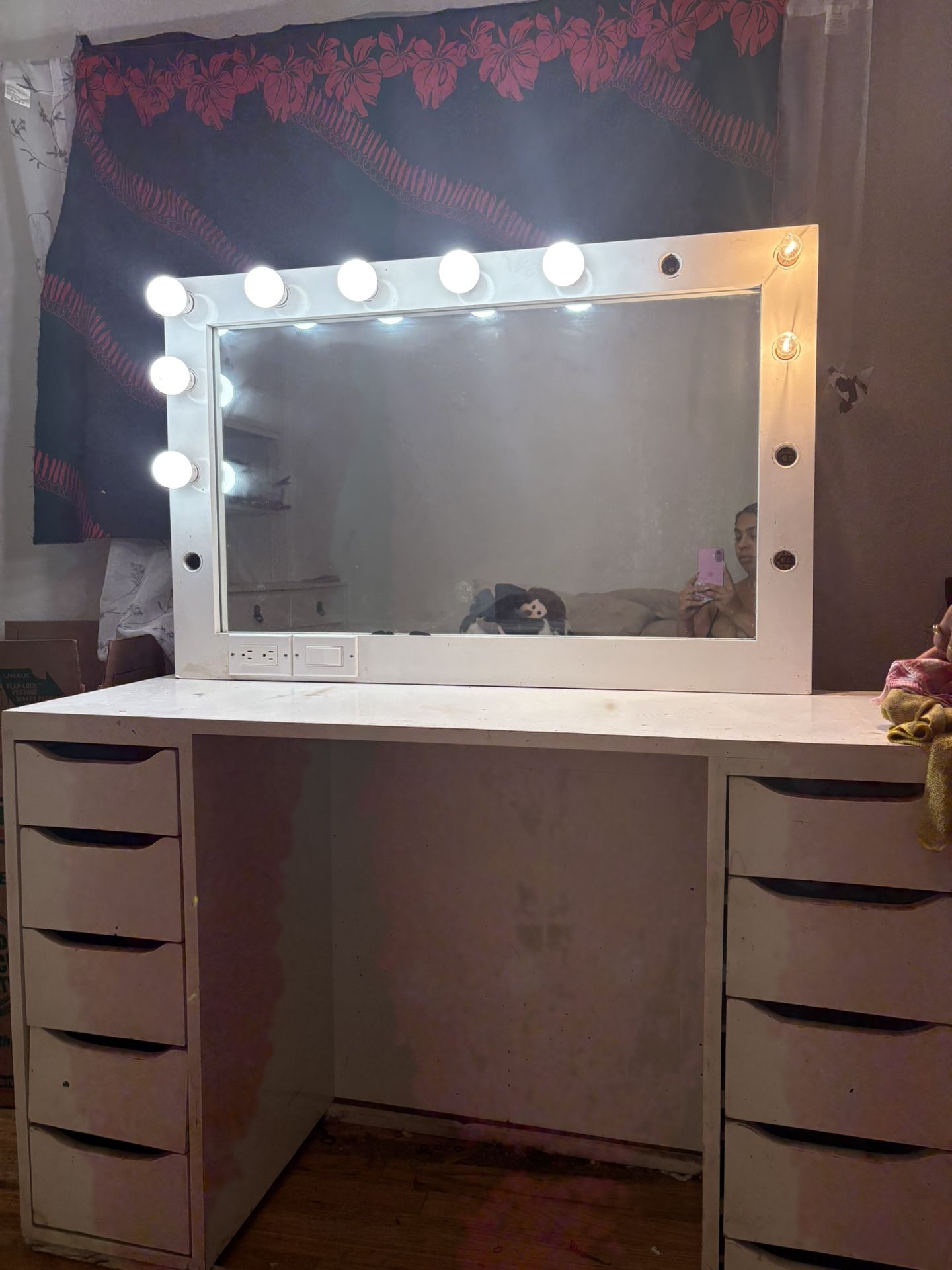 Makeup Vanity with Mirror and lights Two electrical plug ins On and off switch 10 drawers . Needs a paint job but everything works perfectly! $100 OBO