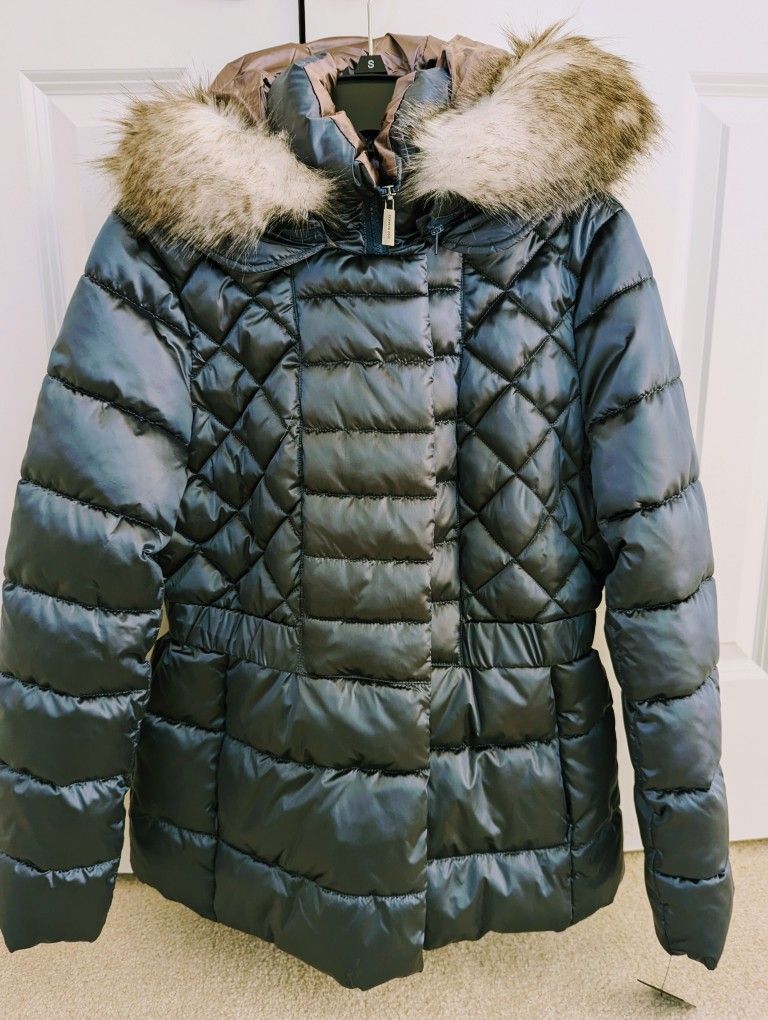 Brand new with tag women Kenneth Cole puff coat, size s, color Irridescent Lakeblu, it's over $90 on Amazon, very beautiful color, you will love it.