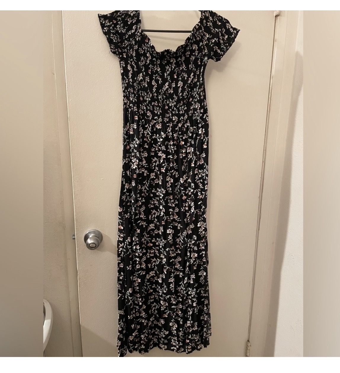 Elegant black maxi dress with a delicate floral pattern. Perfect for any occasion.