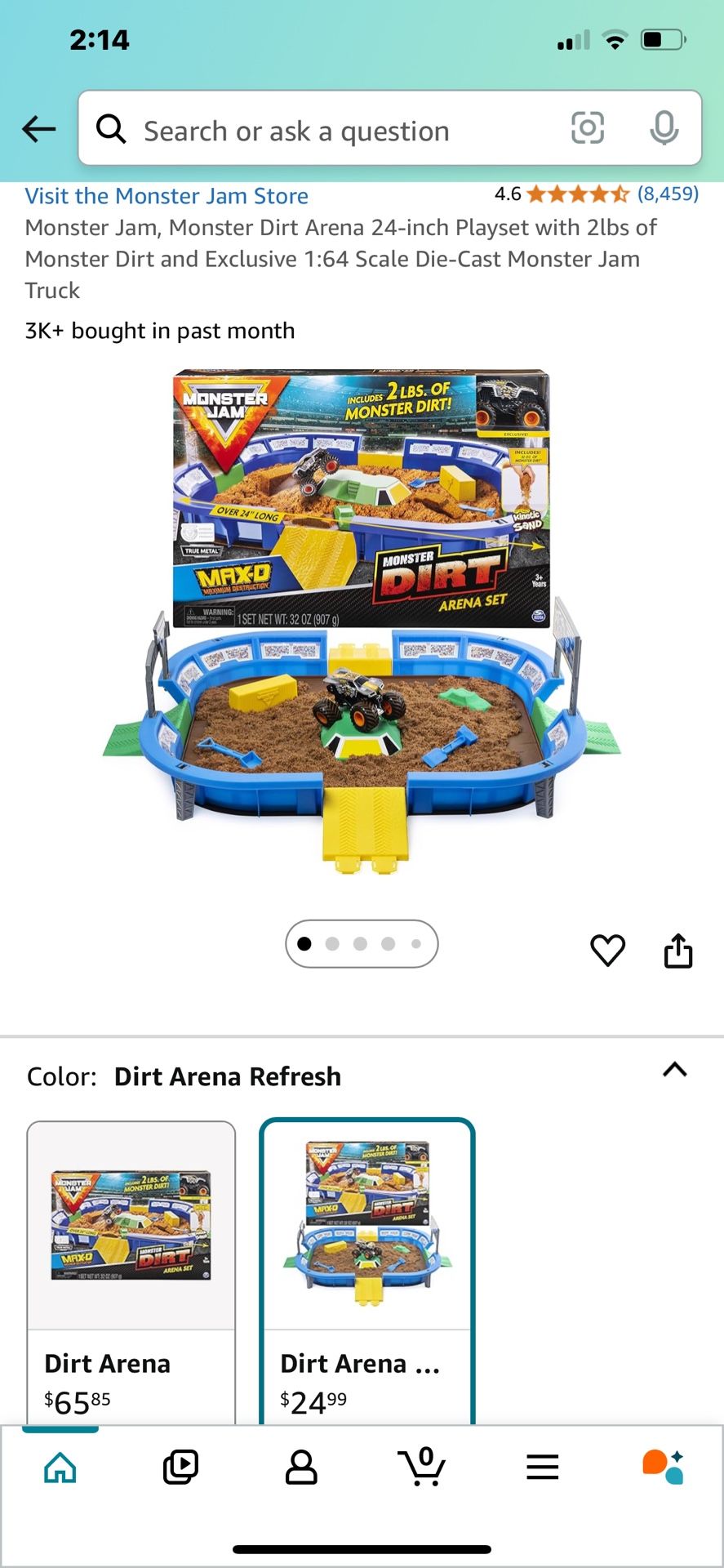 Monster truck dirt arena with blue coneyic sand, 2 trucks, smash trucks and a car, and jumps