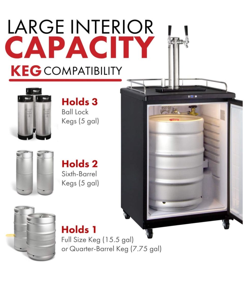 Trade for 50CC Quad. L OR FREESTANDING USE: The Kegco Z163B-2 features a durable construction, high powered performance, and quiet and energy efficient operation that make it suitable for both commercial and residential applications. It has been CSA certified to conform to NSF/ANSI 7. INCLUDES COMPLETE KEG TAPPING KIT: The Z163B-2 comes complete with a double tap draft dispense system and everything you need to tap two domestic D system kegs, including a dual faucet stainless draft tower, two chrome faucets, an empty 5 lb. CO2 tank, a double gauge CO2 regulator, and two D system keg couplers. POWERFUL COOLING TECHNOLOGY: Intuitive push button controls and a clear LED display make it easy to precisely set the internal temperature between 32 and 75 degrees Fahrenheit, one of the widest available temperature ranges of any keg dispenser on the market today. Fan-forced cooling helps maintain the optimal refrigerated storage environment, and an air-cooled draft tower ensures that every drop of beer remains refreshingly chilled from the keg to your glass. CONVENIENT DESIGN FEATURES: This beer dispenser has all of the same great features that you've come to appreciate in other Kegco models, like an easy-to-clean removable built-in drip tray, a chrome guardrail that helps prevent glasses from sliding off of the countertop, and easy rolling casters that allow you to easily move the unit from room to room in your home or business! These casters lock to keep the unit from moving again once it's in position. LARGE INTERIOR: The generously sized 5.8 cu.ft. interior can hold one full size keg (including Miller kegs, Coors kegs, and rubber kegs), one pony keg, one quarter slim keg, two 5 gallon commercial kegs, three ball lock kegs, or two pin lock kegs. When you're not using it to store and dispense kegs, you can use the three wire storage shelves to convert the keg refrigerator into a regular all-refrigerator. The unit measures 35.875" H x 24.375" W x 24" D.