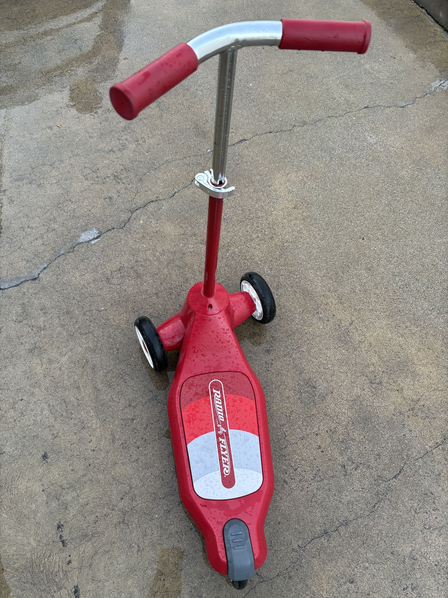 Radio Flyer Grow With Me Beginners Scooter for kids in red. Has wide non-slip deck and adjustable handlebar. Perfect for toddlers to learn balance and coordination. Easy to maneuver. In great condition.