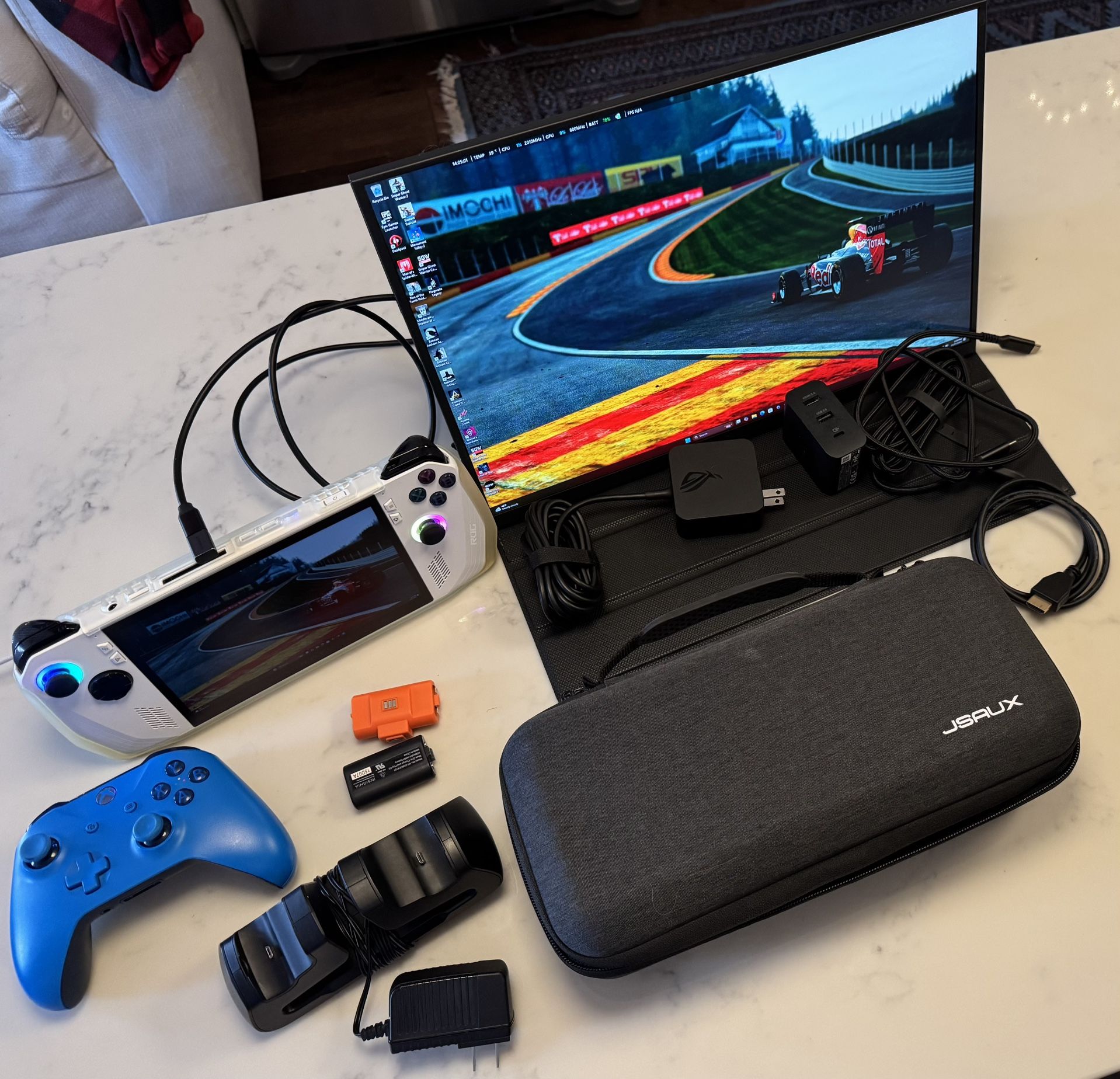 Selling my barely used Asus ROG Ally Z1 Extreme and portable playing setup. Windows based handheld gaming system with AMD Ryzen Z1 Extreme chipset, 16GB Memory and 512GB Storage. Comes with the following as a package: 1. Asus ROG Ally Z1E handheld console 2. Original 65W charger 3. Original Asus dock that doubles up as a charger. The dock can be used to connect it to a screen to play. 4. Uperfect 18.5” 2K 144hz Portable Monitor with cover/stand 5. Large JSAUX carry case 6. Original Xbox Controller (Blue) 7. 2x rechargeable batteries with battery charger Bought it last year, played a handful times but has mostly been unused. In a great clean condition. I also installed a pure copper heat sink to help reduce peak temperatures while playing. Never used the SD Card slot. Pickup in Capitol Hill/Kingman Park Neighborhood. Can deliver in the DMV area for a small fee. NO SHIPPING. CASH ONLY