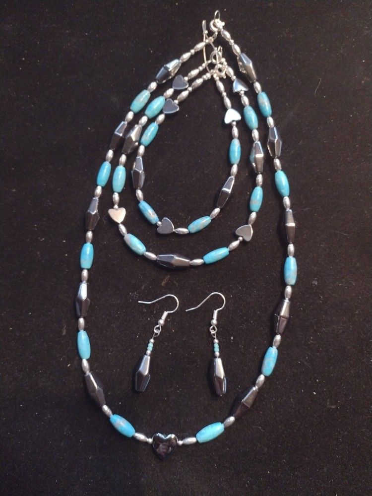 4 piece set Hematite turquoise set Necklace, anklet, bracelet, earrings. Fit to order all four starting price $30 great gift for Christmas.