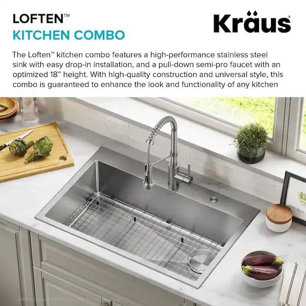 KRAUS Loften 33 in. Drop In/Undermount Single Bowl 18-Gauge Stainless Steel Kitchen Sink with Pull Down Faucet $199
