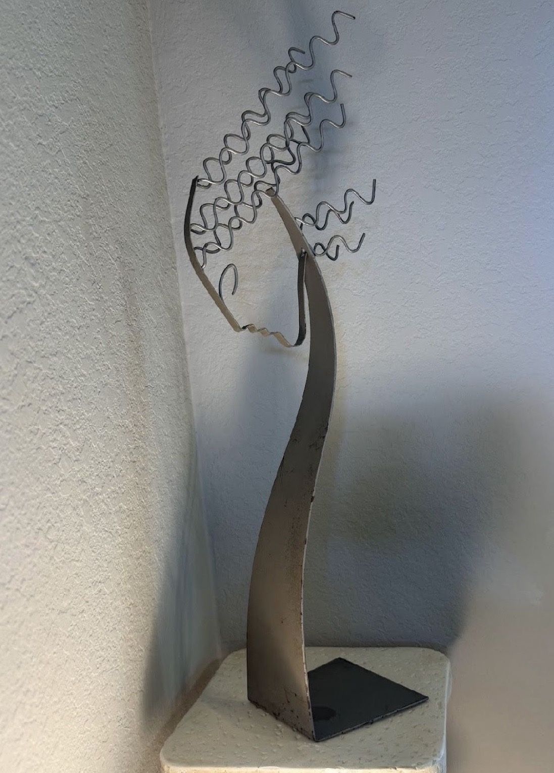 Bring a touch of modern charm to your space with this handcrafted metal sculpture, beautifully shaped into an abstract face with whimsical curly wire hair. Its sleek, minimalist form and artistic movement make it a perfect statement piece for any shelf or corner. A unique blend of elegance and personality, this sculpture adds character and creativity to any home. The measurements of this item are 6"x6.5"x30.5". If you’re interested please send me a message, serious inquiries only. ITEM #1028