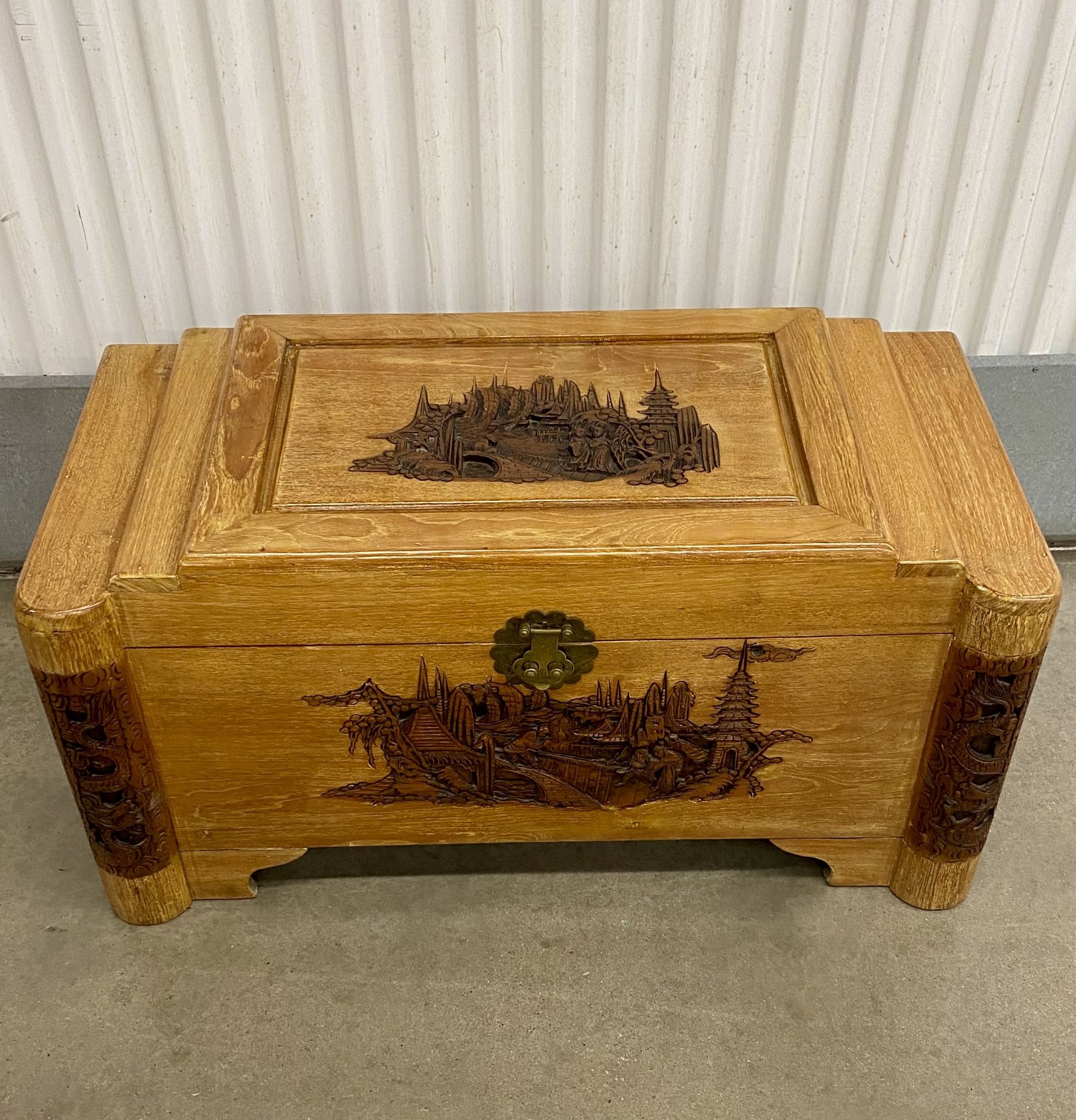 Heavy weight solid camphor wood, which is naturally moth-resistant, making it ideal for storing clothing or linens and has an amazing aroma. Features intricate carvings of oriental scenes, such as harbor or coastal landscapes, on all sides and the lid 19”in tall 37”in wide 17.5”in depth