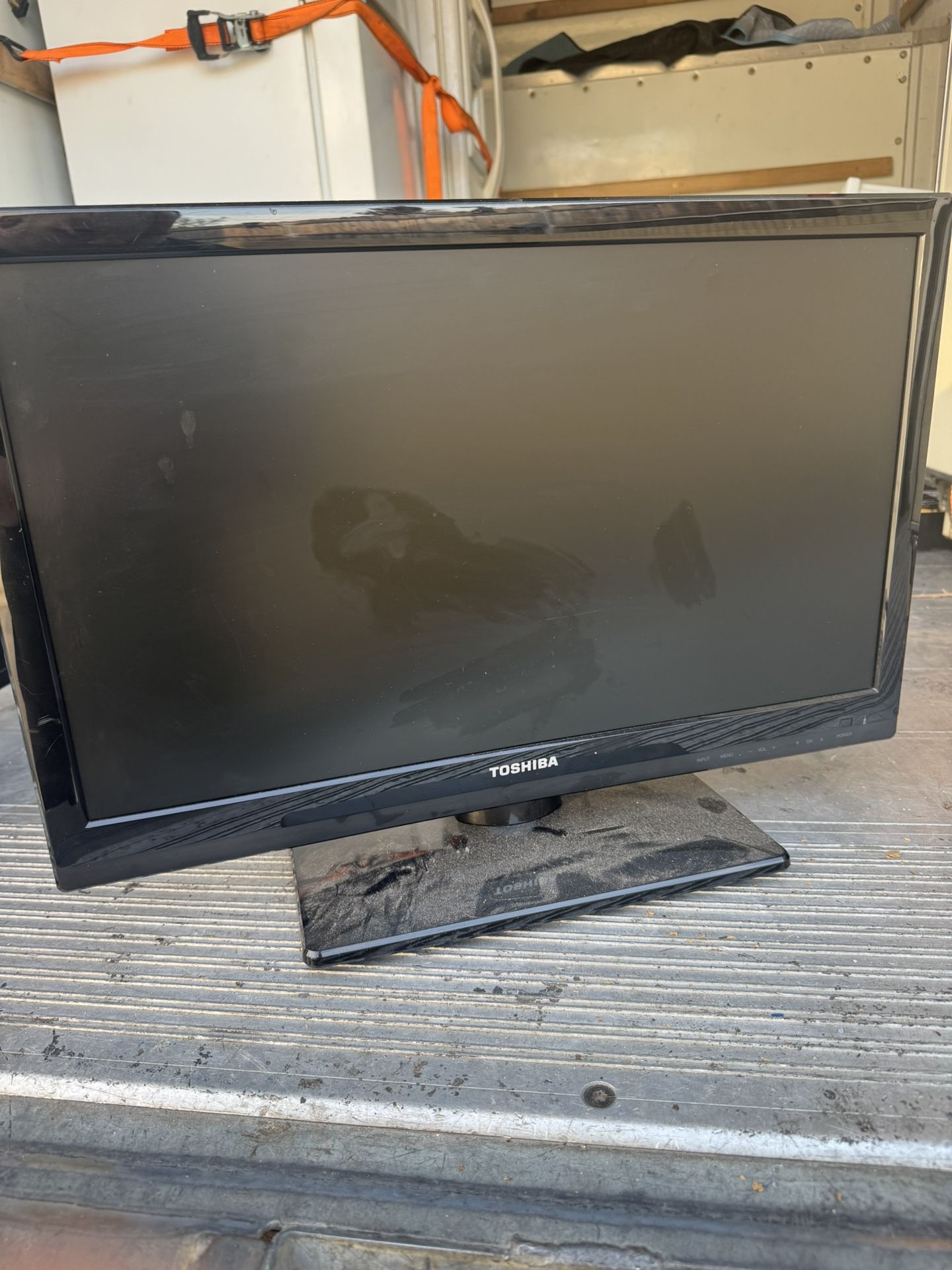 Toshiba 24” HDTV, fully functional. Good for streaming devices, gaming consoles, or spare room. HDMI, VGA, and AV inputs. Includes stand and power cord. No remote. Normal cosmetic wear. See photos for condition.