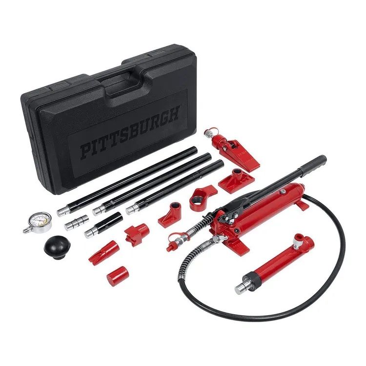 Pittsburgh Hydraulic Portable Equipment Kit 20,000 lb Poweriul 10 ton hydraulic ram pump • Interfocking extension tubes • 18" pump hance with cushion grip for easy pump action • All steel construction SPECIFICATIONS: Maximum Force: 10 ton Maximum Pressure: 10,000 PS/ Extension lubes: 3-3/4" 7-34:11-34"(¥2), 21-5/8” Ram Extension: 12" to 17-1/2" Max Spreader Opening: 3-3/4" Spreader Force: 1/2 ton Hose Length: 74" Hose Fittings: 1/4"-18 NPT