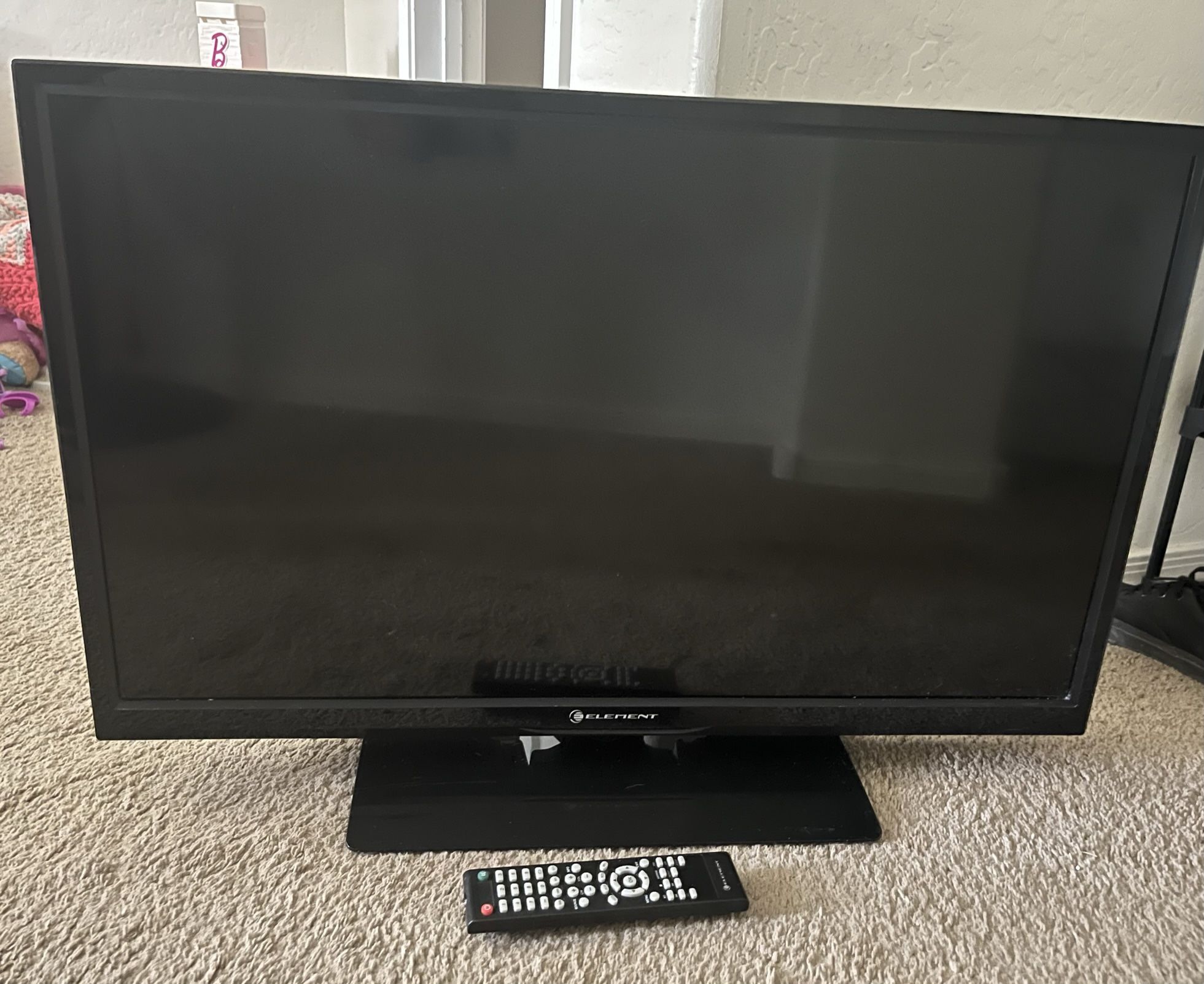 Element 32 inch TV. Comes with remote (missing back to remote)