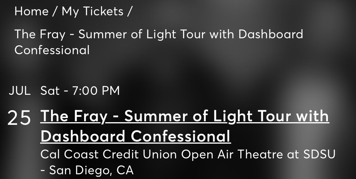 5 Tickets - $80/each JUL 25 Sat - 7:00 PM The Fray - Summer of Light Tour with Dashboard Confessional Cal Coast Credit Union Open Air Theatre at SDSU - San Diego, CA