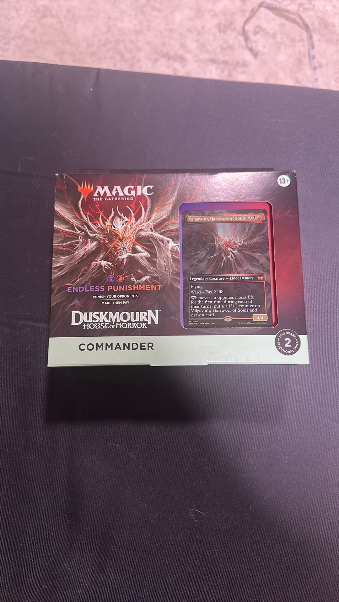 Brand New & Factory Sealed — Never Opened Selling a Magic: The Gathering Commander Deck – Endless Punishment. This precon is built around aggressive value, graveyard recursion, and punishing board presence, making it perfect for players who like to pressure the table while generating long‑term advantage. Very sought after precon Factory contents include: • 100‑card ready‑to‑play Commander deck • 2 foil legendary cards • 98 non‑foil cards • Collector Booster sample pack • 10 Archenemy cards • 10 double‑sided tokens • Deck box • Strategy insert & reference card Condition: Brand new, sealed Great for: Commander nights, collectors, or anyone wanting a strong out‑of‑the‑box deck with a graveyard‑centric theme.