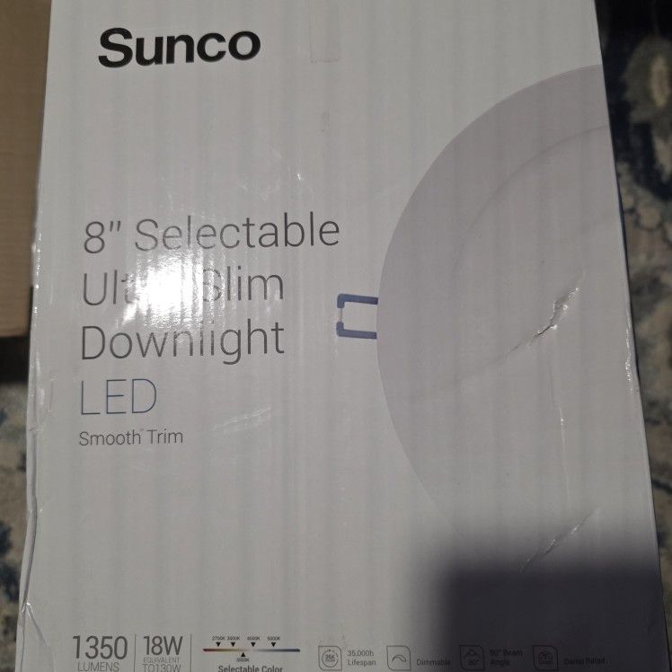 Sunco 6 Pack 8 Inch Ultra Thin LED Recessed Canless Smooth Trim Wafer Thin Indoor Ceiling Lights Slim Selectable 2700K/3000K/4000K/5000K/6000K Dimmable 18W 1350 Lumens with Junction Box 3 boxes $50 Each Brand New.