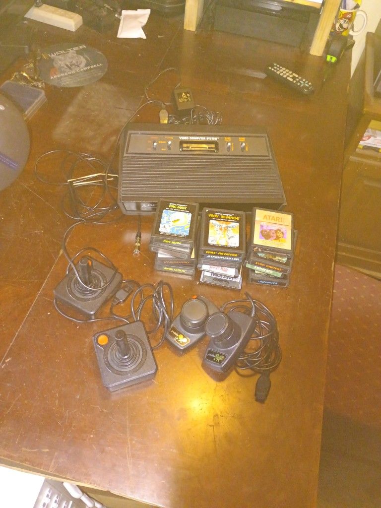 This Atari 2600 has been tested and played thoroughly. Comes with 13 games. Four controllers, and quick thread in to TV connectio. Games include Pac-Man air sea Battle vanguard warlords Euros revenge Star Master maze craze Spider-Man trick shot ET star raiders tennis and defender. Picture show condition better message when you want to pick up.