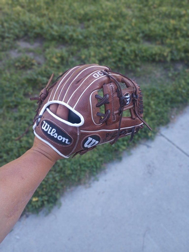 Size: 11 1/2 inches Real leather broken in game ready no rips. In excellent condition barley used. Feels almost new Great for practice or games or just to play catch at home or the Park. Wilson Baseball Infield glove Outfield glove Pitcher glove