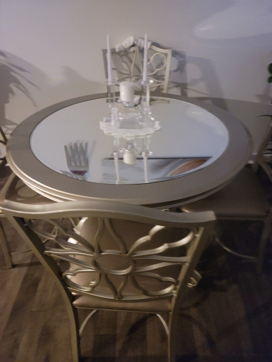 Mirriored Top Dining Table and 4 chairs for sale $175. We paid $800. I had this set for a while. I love this set and i don't want to get rid of it, but i think it's time. It has a few wear and tear on the rim of the table and on two seat cushions. You can also replace the cushions or change the cushion to different colors if you wish as long as it's the same size cushions. The table set it self is in very good condition. It's a heavy solid set. SOLD AS IS. CASH AND CARRY ONLY. NO REFUNDS AND NO RETURNS.